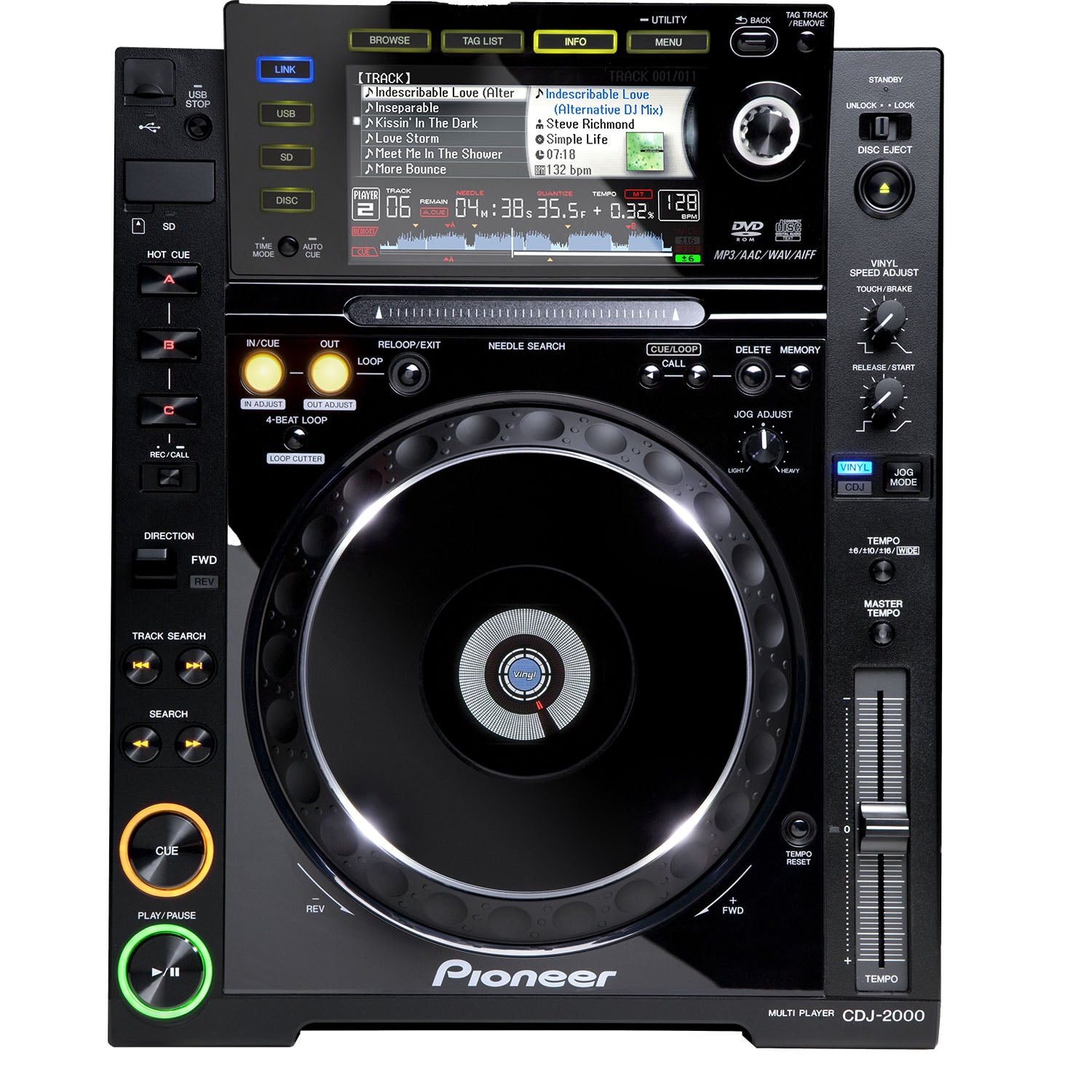 Introducing a major leap forward for the club standard CDJ series: the CDJ-2000 – our new professional player for the digital age. The CDJ-2000 fizzes with fresh DNA and can play music from multiple sources, including CD, DVD, USB storage devices and SD memory cards. It also comes with the revolutionary music database management software for DJs: rekordbox™. Based on our ‘Prepare & Perform’ concept, rekordbox works (for both Mac and PC) like the leading music database management software, but is more creative and more DJ-friendly.